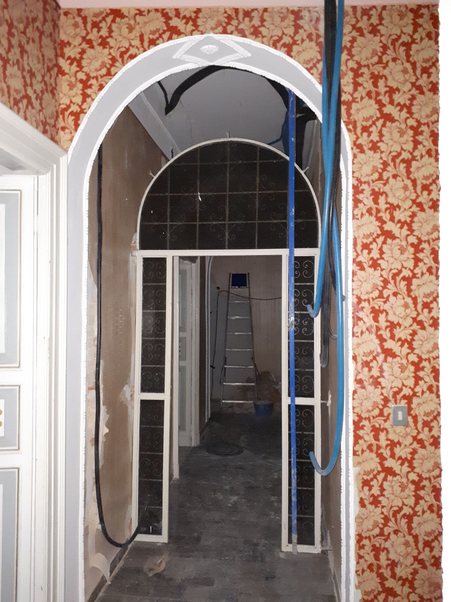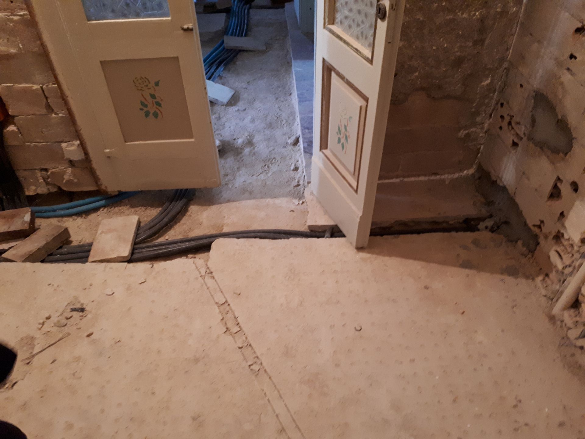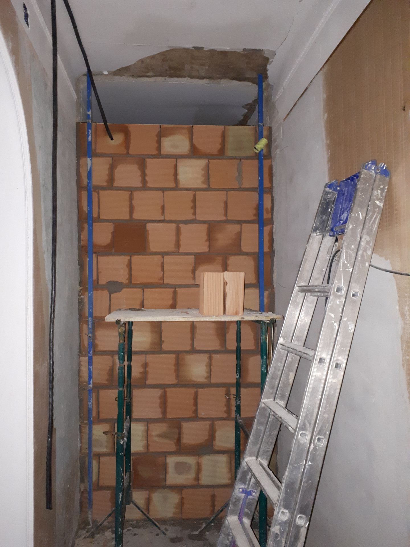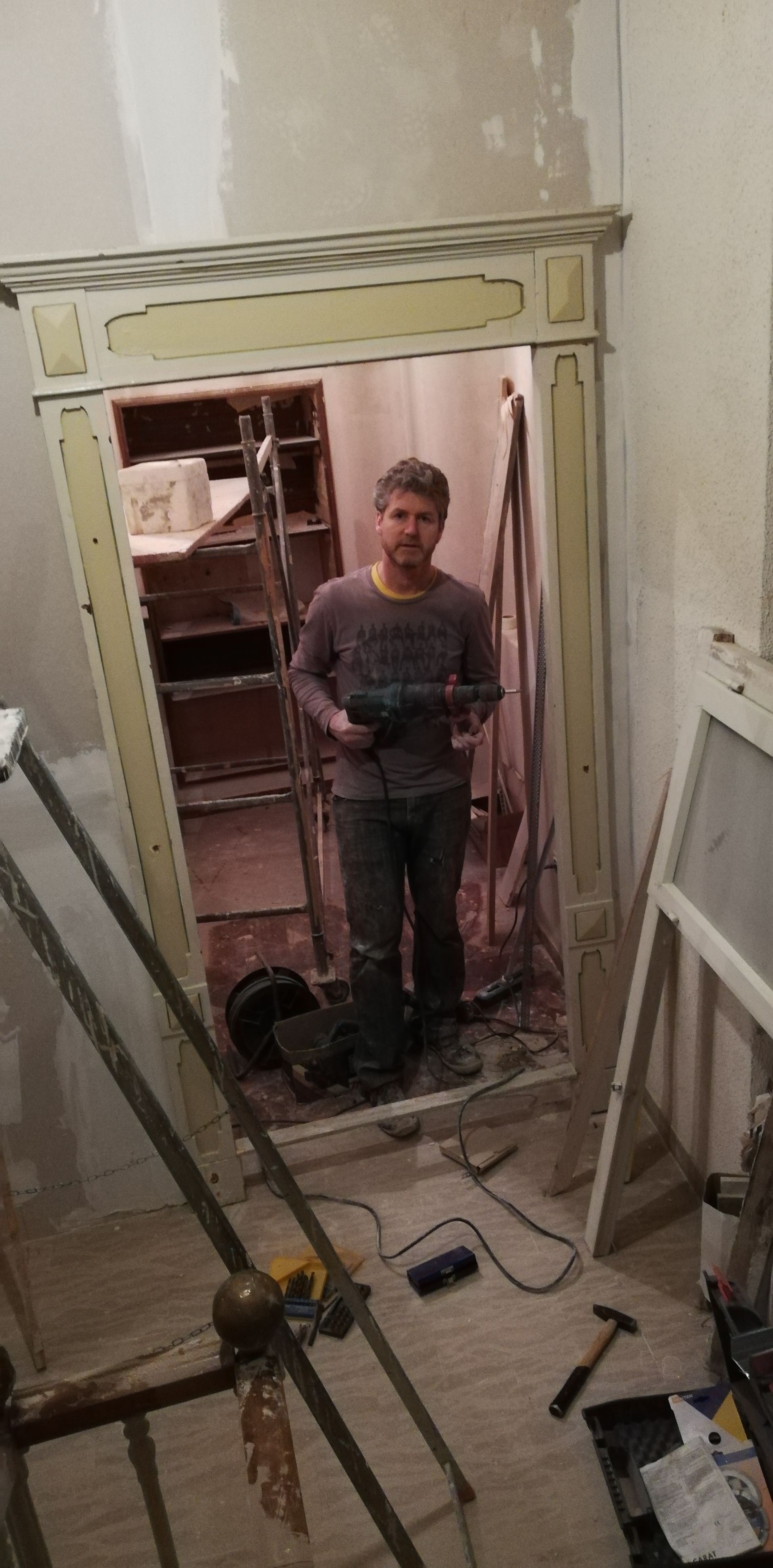 Nou dat hebben we geweten, want na het opbouwen van een enorme steiger lag in september 2018 binnen een mum van tijd het dak eraf en delen van de hardstenen vloer eruit. Dan begint het ineens op een bouwval te lijken en het werd nog erger toen de leidingen ook in de muren gefreesd werden. Wat een slagveld en houd dan je hoofd maar eens koel. Gelukkig had René vooraf allemaal tekeningen gemaakt hoe het een en ander moest gaan worden. Hier een deur weg en daar weer opbouwen, een muurtje dicht en weer een andere open en ga zo maar door.