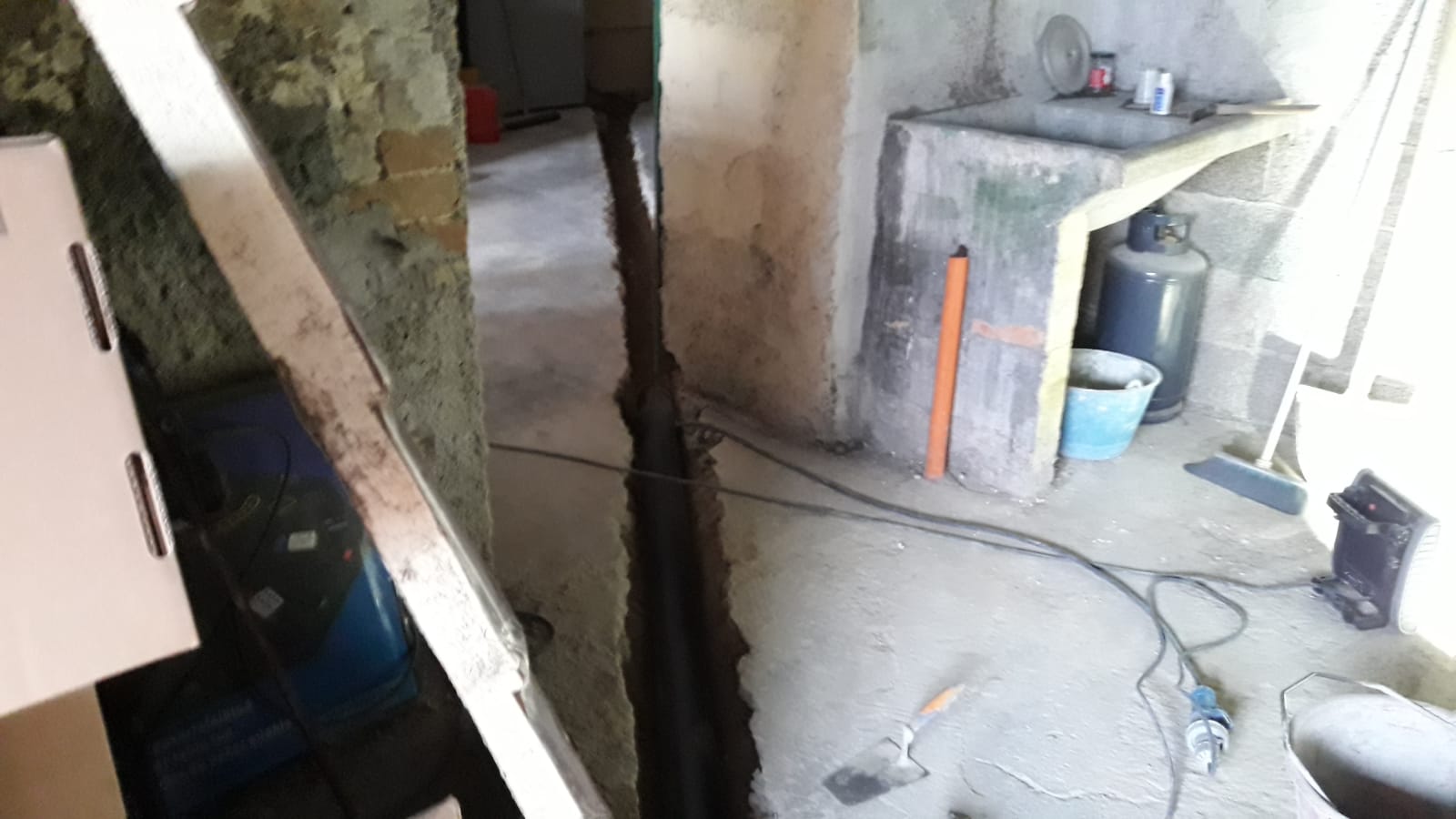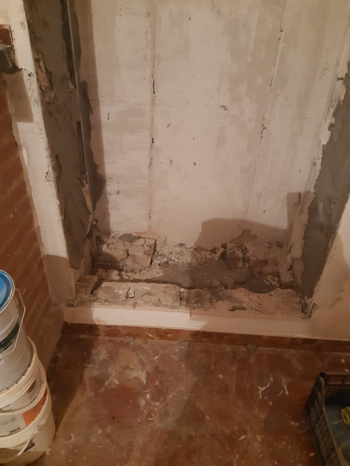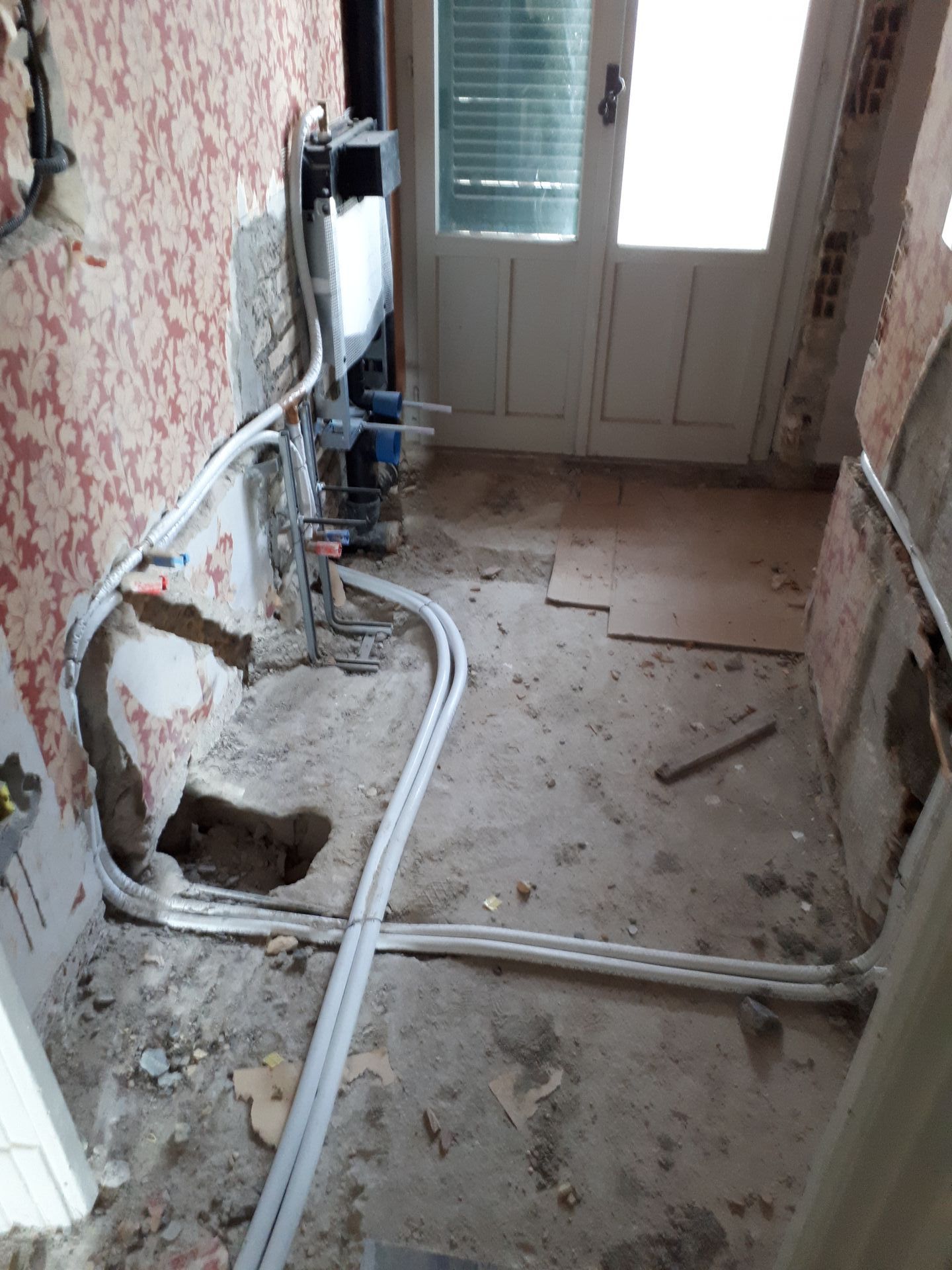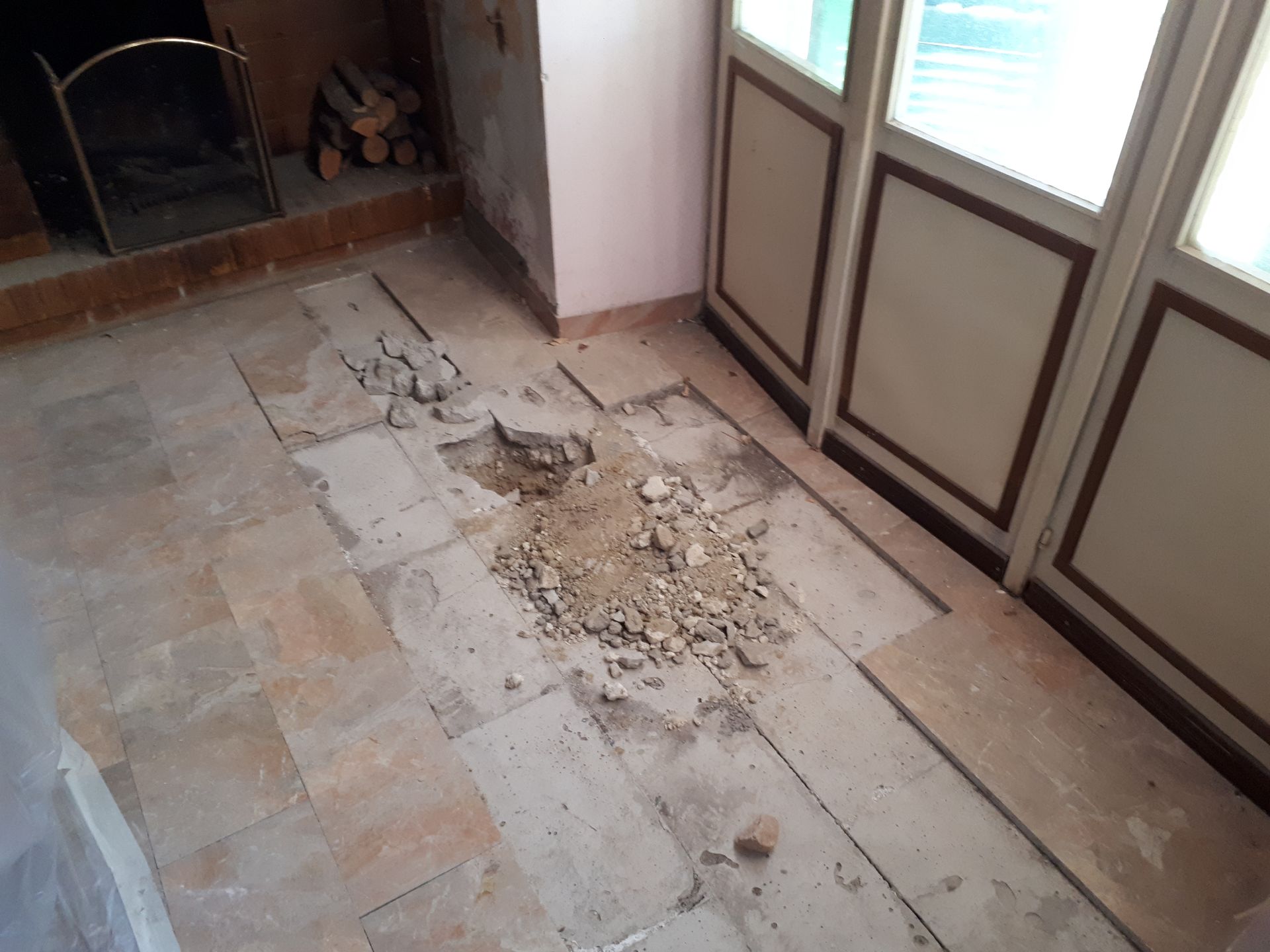 Nou dat hebben we geweten, want na het opbouwen van een enorme steiger lag in september 2018 binnen een mum van tijd het dak eraf en delen van de hardstenen vloer eruit. Dan begint het ineens op een bouwval te lijken en het werd nog erger toen de leidingen ook in de muren gefreesd werden. Wat een slagveld en houd dan je hoofd maar eens koel. Gelukkig had René vooraf allemaal tekeningen gemaakt hoe het een en ander moest gaan worden. Hier een deur weg en daar weer opbouwen, een muurtje dicht en weer een andere open en ga zo maar door.