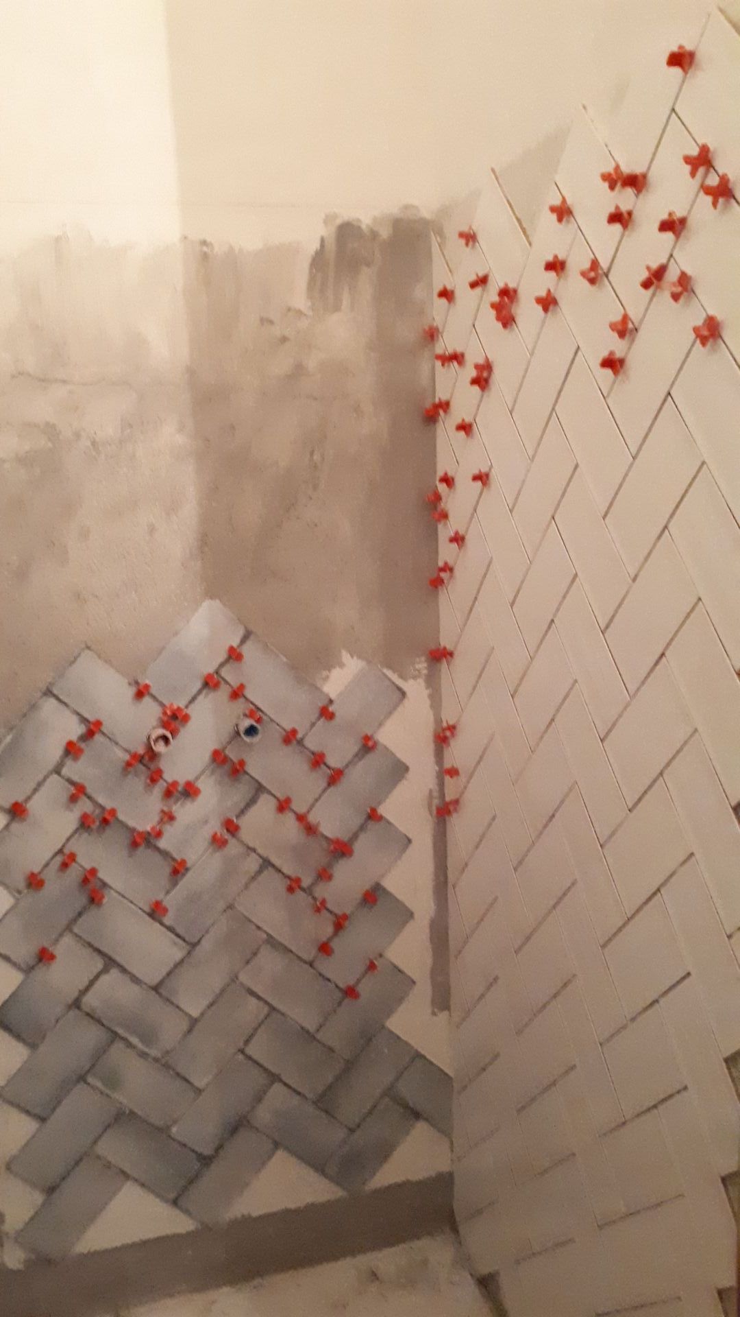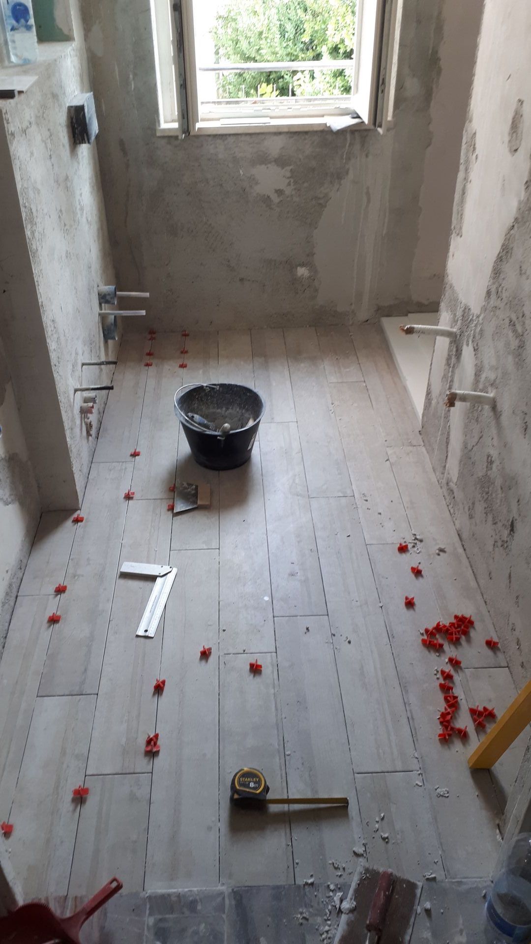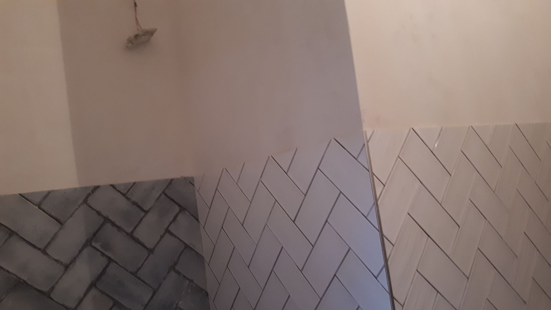 En wij zaten ook niet stil natuurlijk. Elke vakantie stonden wij er weer. Terwijl Kim zorgt dat er geverfd, schoongemaakt en ingericht wordt, begint René in de zomervakantie aan de eerste gasten badkamer op de tweede verdieping. Dat was dus niet af aan het eind van de zomer, nog veel te veel gedoe eromheen dat ook geregeld moest worden en ook nog een vrouw die opeens vindt dat je je eerste badkamer in visgraat moet tegelen... Dan maar in de herfstvakantie het afmaken. Eind goed al goed, de eerste keer tegelen was gelukt met resultaat! Met al het geregel eromheen en alle andere klussen die ook gedaan moesten worden, zoals behangen, keuken monteren enzovoorts besloten we ook op zoek te gaan naar iemand die de overige badkamers kon tegelen. En hoeveel geluk kun je hebben als blijkt dat Mitik dit ook super goed kan. De keuze was snel gemaakt!