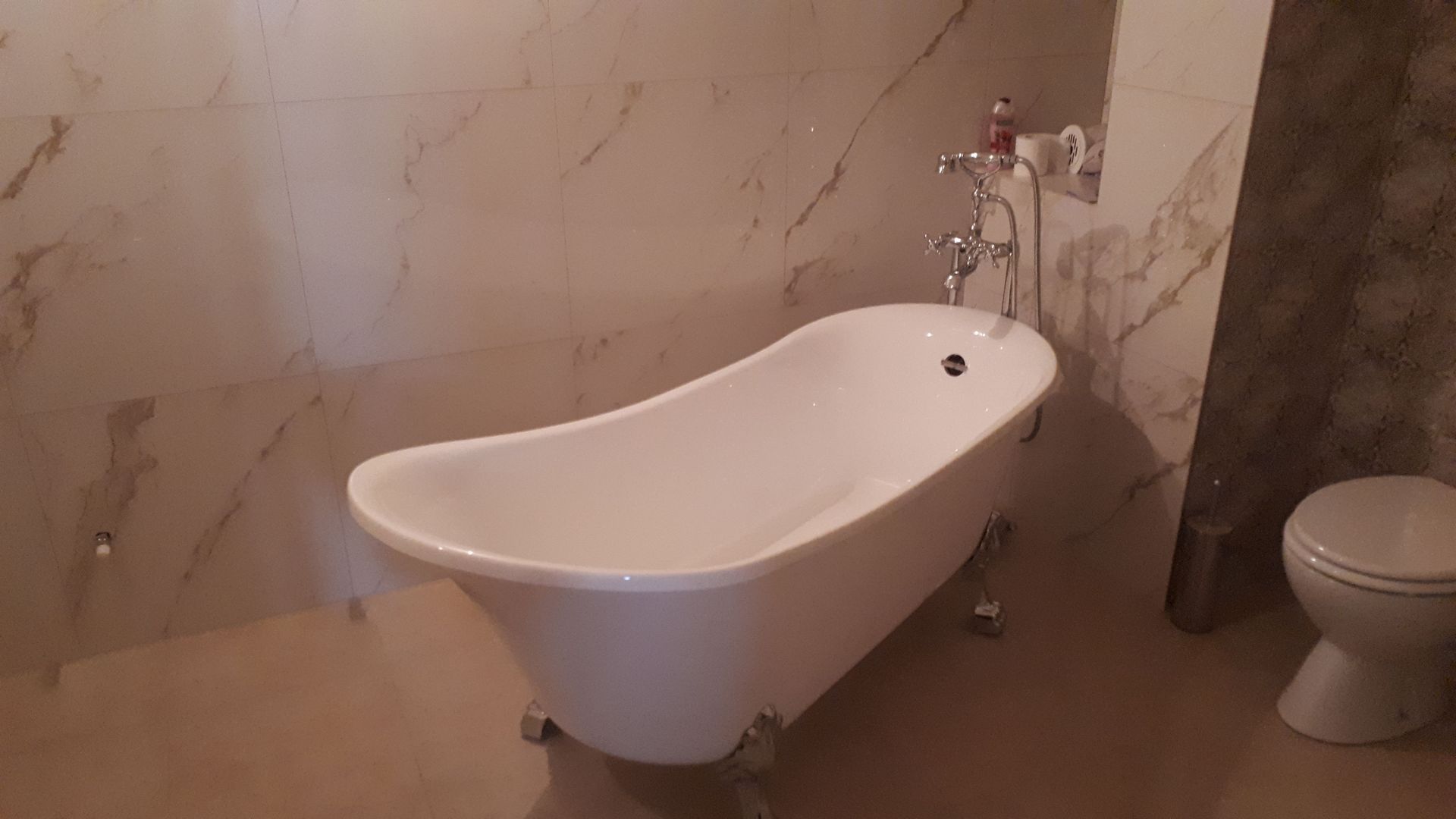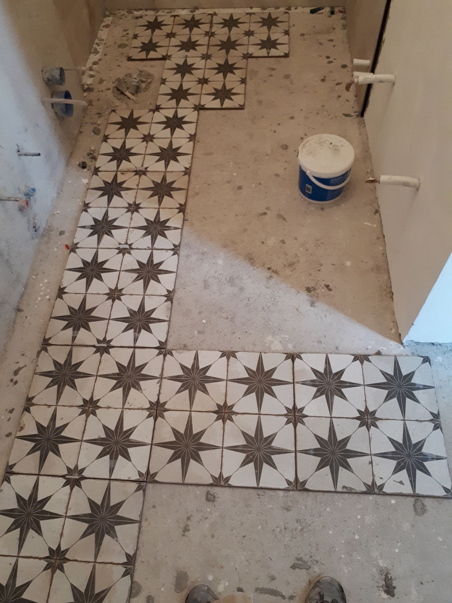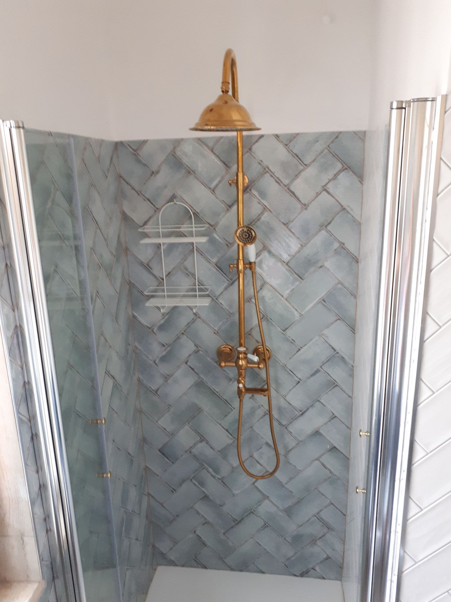 En wij zaten ook niet stil natuurlijk. Elke vakantie stonden wij er weer. Terwijl Kim zorgt dat er geverfd, schoongemaakt en ingericht wordt, begint René in de zomervakantie aan de eerste gasten badkamer op de tweede verdieping. Dat was dus niet af aan het eind van de zomer, nog veel te veel gedoe eromheen dat ook geregeld moest worden en ook nog een vrouw die opeens vindt dat je je eerste badkamer in visgraat moet tegelen... Dan maar in de herfstvakantie het afmaken. Eind goed al goed, de eerste keer tegelen was gelukt met resultaat! Met al het geregel eromheen en alle andere klussen die ook gedaan moesten worden, zoals behangen, keuken monteren enzovoorts besloten we ook op zoek te gaan naar iemand die de overige badkamers kon tegelen. En hoeveel geluk kun je hebben als blijkt dat Mitik dit ook super goed kan. De keuze was snel gemaakt!