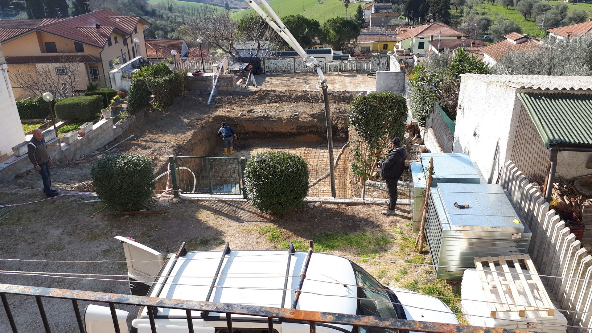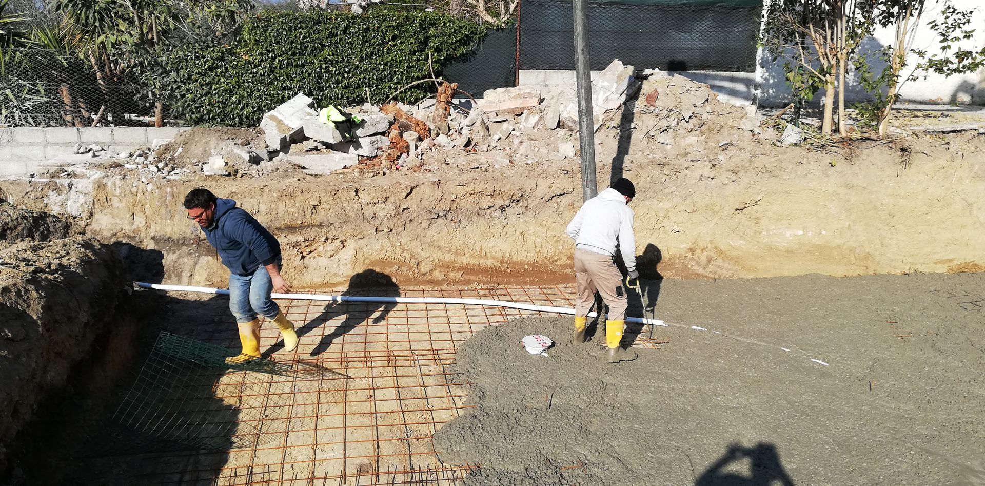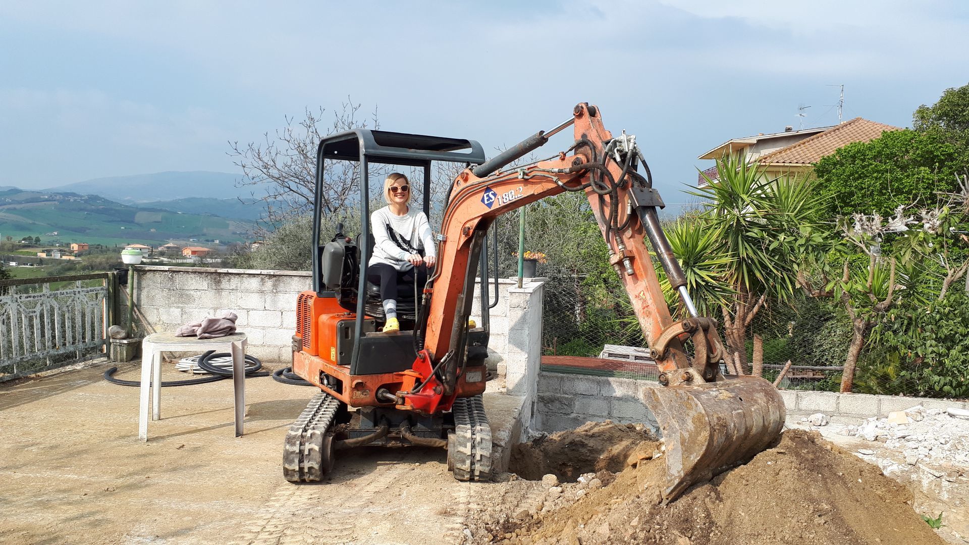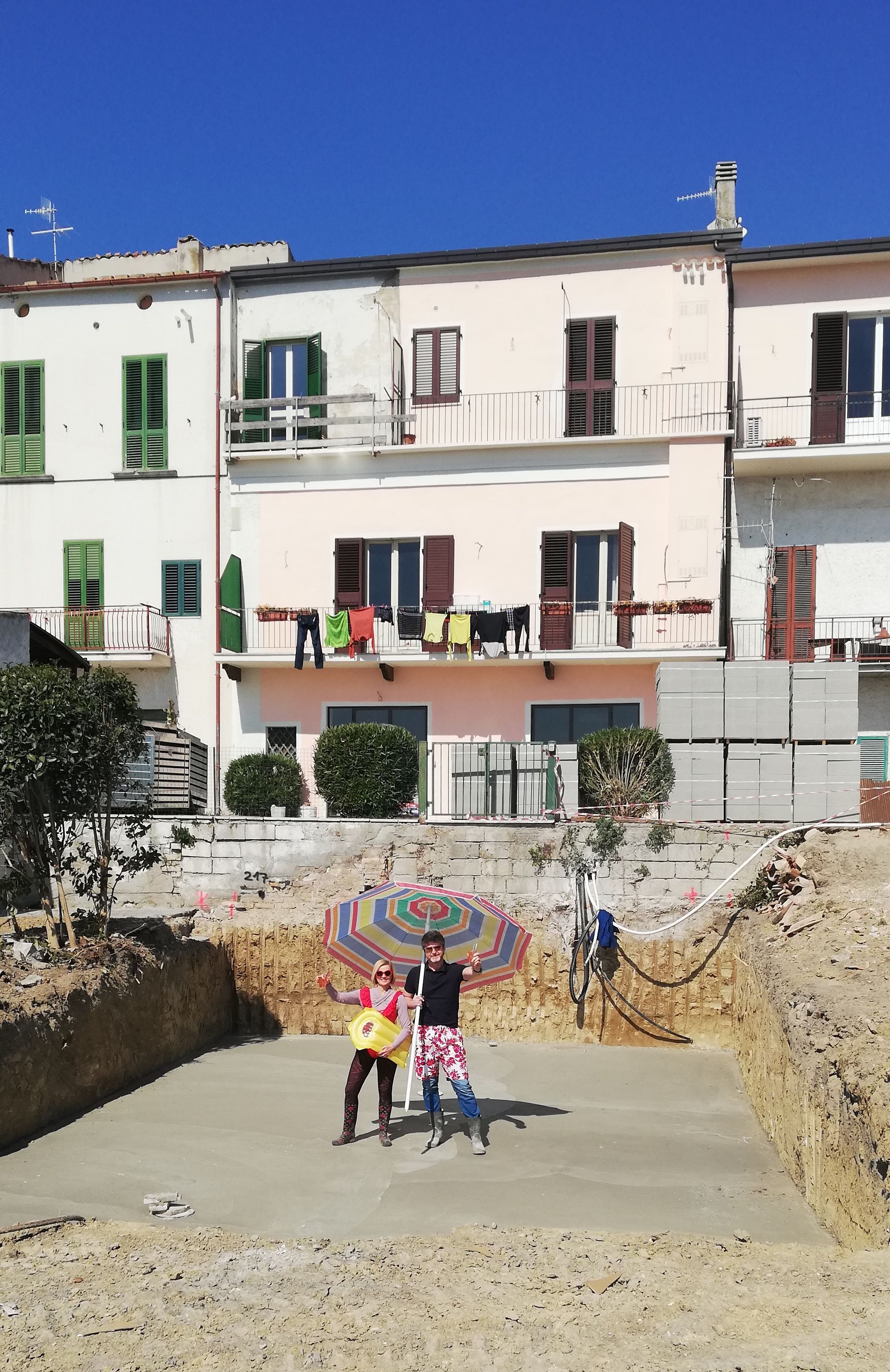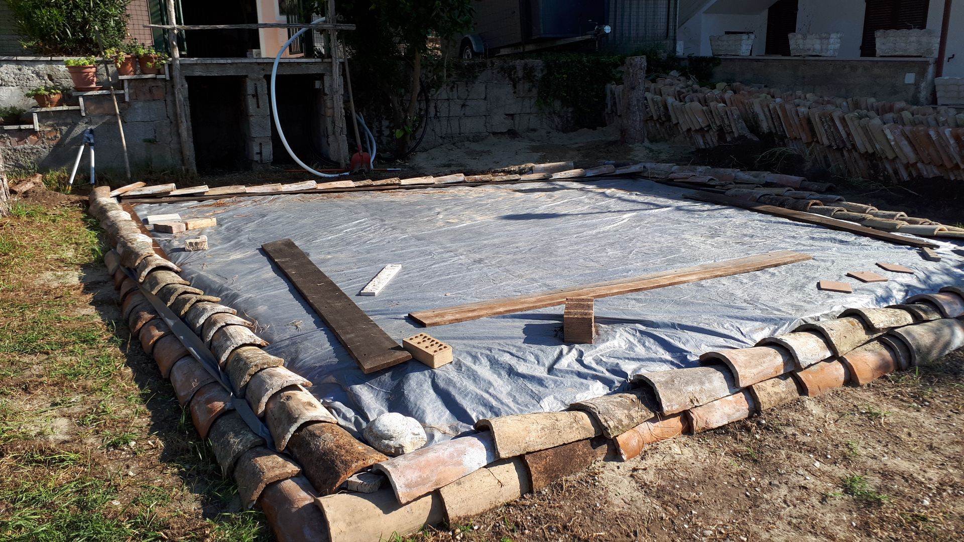 Kim en René hebben 7 weken verblijf in Italië geregeld, waarvan we een paar weken vrij zijn en een paar weken ook in Nederland gewerkt moet worden (online, het enige goede dat Corona heeft gebracht). De werkzaamheden starten halverwege maart, iets later dan verwacht. Het gat wordt gegraven en René plaatst de afvoerleidingen van het zwembad. De cementvloer wordt gestort en René kan het zwembad verder op gaan zetten. Samen met de aannemer, die er vaker niet is dan wel, wordt het leidingwerk in de grond gelegd en kan het grondwerk verder afgemaakt worden.